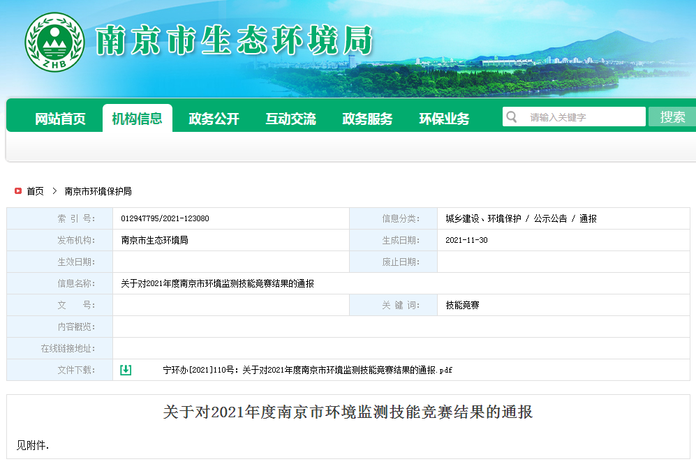 10月16日-27日,由南京市總工會(huì)、市人力資源和社會(huì)保障局、共青團(tuán)南京市委主辦,南京市生態(tài)環(huán)境局和南京市農(nóng)林水環(huán)保工會(huì)聯(lián)合會(huì)承辦,江蘇省南京環(huán)境監(jiān)測中心協(xié)辦,南京環(huán)境保護(hù)產(chǎn)業(yè)協(xié)會(huì)支持的2021年南京市環(huán)境監(jiān)測技能競賽決賽在江寧橫溪街道正式開賽,來自市生態(tài)環(huán)境系統(tǒng)和社會(huì)化環(huán)境監(jiān)測機(jī)構(gòu)的16支環(huán)境監(jiān)測隊(duì)伍在此聚集進(jìn)行環(huán)境監(jiān)測大比武。本次競賽由南京市生態(tài)環(huán)境局局長錢鋒擔(dān)任競賽組委會(huì)主任,同時(shí)專設(shè)專家及監(jiān)督委員會(huì),確保競賽結(jié)果公正公允。我司也派出選手參賽,取得團(tuán)體一等獎(jiǎng)和多個(gè)個(gè)人獎(jiǎng)項(xiàng)的佳績!